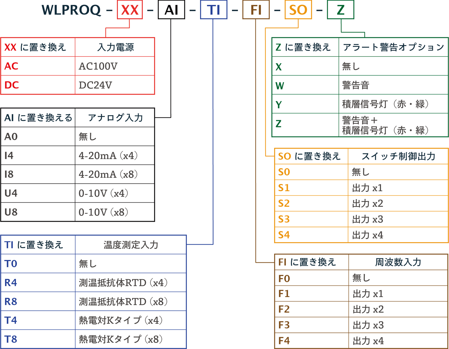 ▪️DC: DC24V ▪️I4: 4-20mAアナログ入力 x4 ▪️T0: 温度測定入力無し ▪️F2: 周波数入力 x2 ▪️S2: スイッチ制御出力 x2 ▪️X: アラートオプション無し